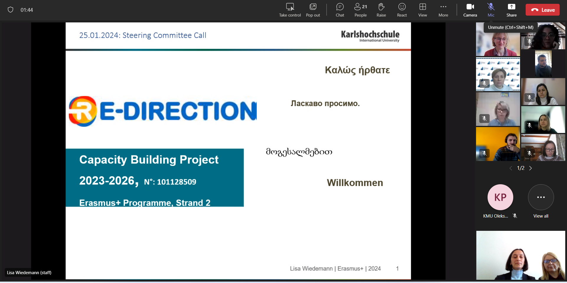 On January 25, 2024 another monthly online meeting was held within the Erasmus+ international project RE-DIRECTION - Redefining Higher Education on a digital context and mainstreaming a common inclusive and green structure based on EU best practices and policy recommendations”. Project management issues, work packages, dissemination plan and details of the Kick-off-Meeting planned in Georgia were discussed.
