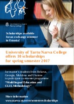 OFFER OF SEMESTER SCHOLARSHIPS IN ESTONIA – 30 days till application deadline!University of Tartu, the oldest university in Estonia and amongst the top 3% of world`s best universities, is glad to announce available scholarships for an exchange semester at Narva College, one of the university`s regional units, for Spring semester 2017.