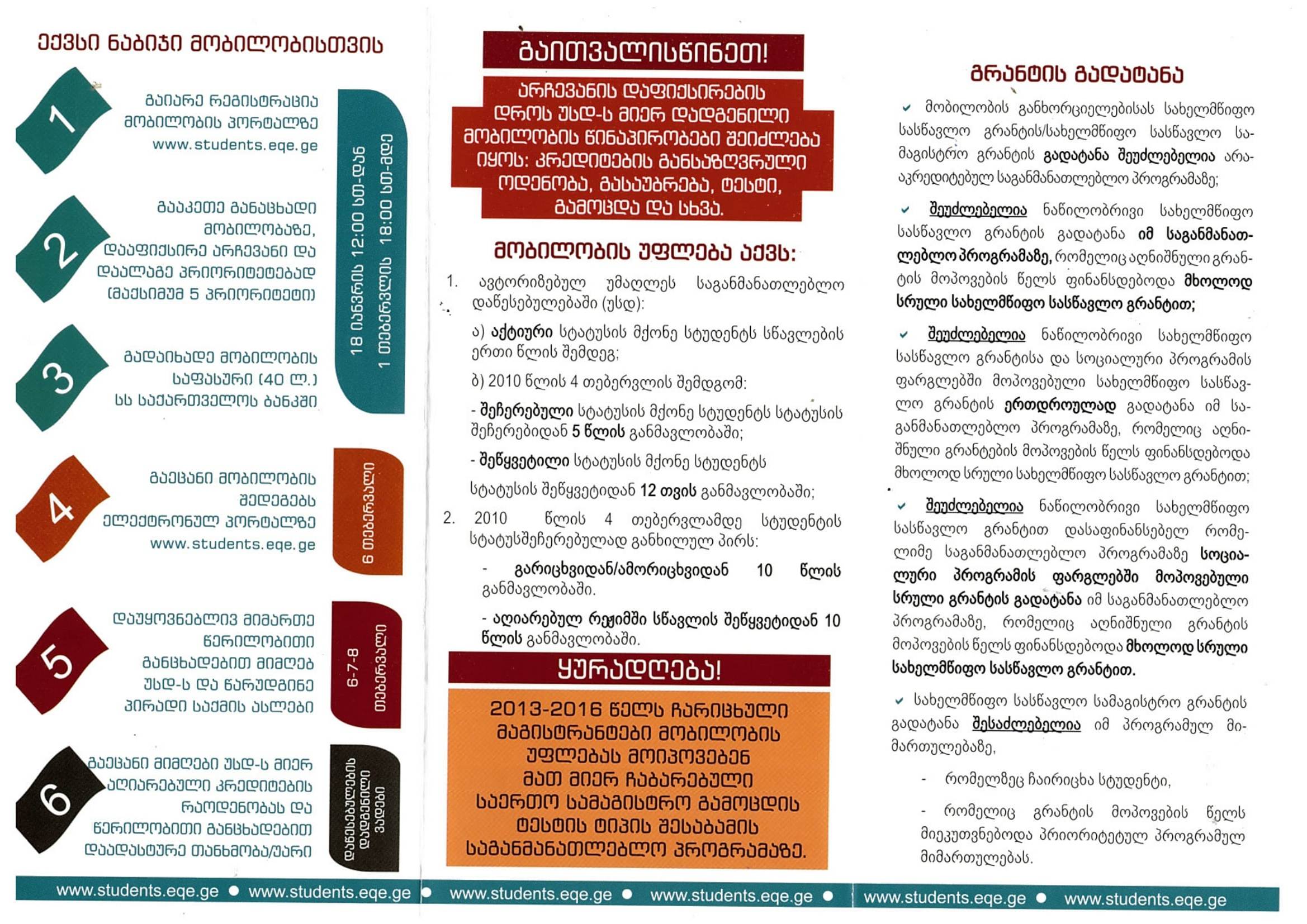 I. 2017–2018 სასწავლო წლის გაზაფხულის სემესტრისათვის მობილობის წესით ჩასარიცხ პირთა ელექტრონულ პორტალზე რეგისტრაციის ვადა განისაზღვრა 2018 წლის 18 იანვრიდან 01 თებერვლის 18 სთ-მდე.