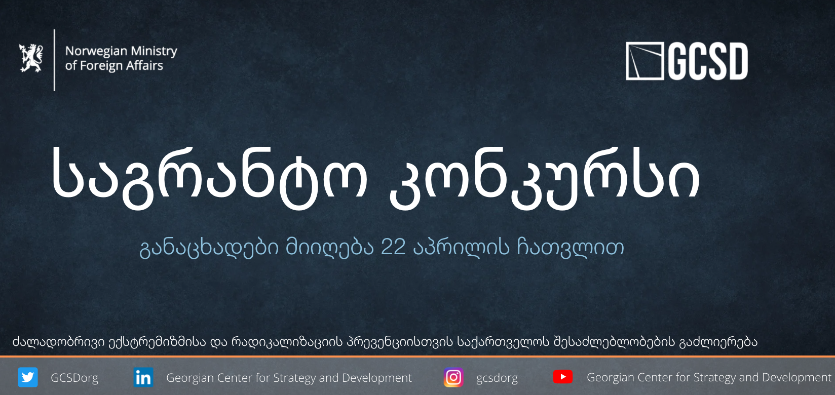 საქართველოს სტრატეგიის და განვითარების ცენტრი (GCSD), პროგრამის - ‘‘ძალადობრივი ექსტრემიზმისა და რადიკალიზაციის პრევენციისთვის საქართველოს შესაძლებლობების გაძლიერება’’ ფარგლებში, აცხადებს საგრანტო კონკურსს, რომლის ზოგადი მიზანია, საქართველოში ყველა ფორმის ძალადობრივ ექსტრემიზმთან და რადიკალიზაციასთან გამკლავება. კონკურსის ფარგლებში გაიცემა 2 გრანტი, ჯამში 200 000 ლარი. გაცემული ერთი გრანტის მაქსიმალური ოდენობა 100 000 ლარს შეადგენს.