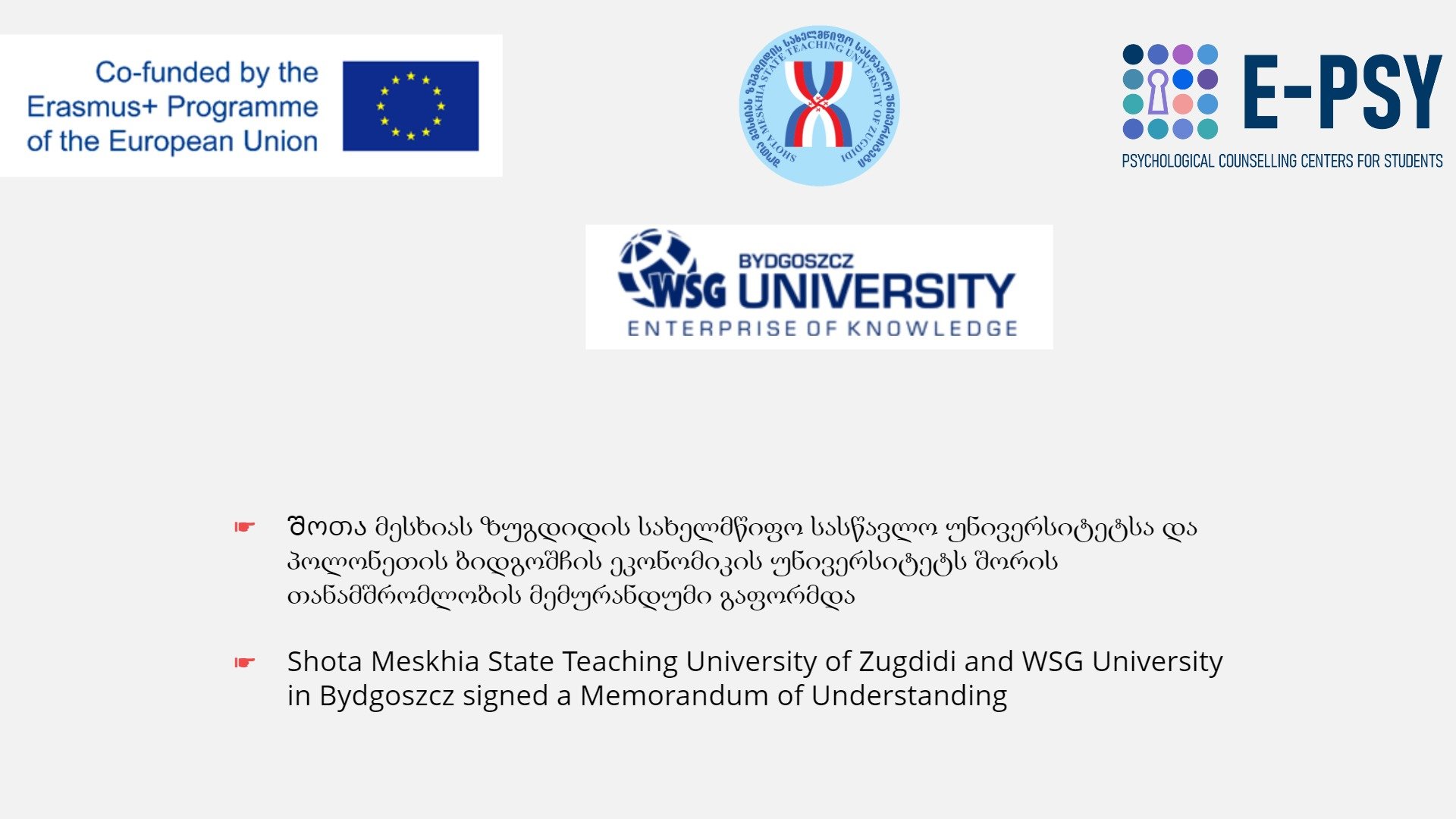 შოთა მესხიას ზუგდიდის სახელმწიფო სასწავლო უნივერსიტეტსა და პოლონეთის ბიდგოშის ეკონომიკის უნივერსიტეტს შორის ხელი მოეწერა ურთიერთანამშრომლობის მემორანდუმს. Erasmus+ საერთაშორისო პროექტის ფარგლებში პარტნიორი უნივერსიტეტების შემდგომი თანამშრომლობა გაგრძელდება კვლევის, განათლებისა და კულტურის სფეროში, რომელშიც ჩაერთვებიან ორივე უნივერსიტეტის სტუდენტები და აკადემიური პერსონალი. იგეგმება გაცვლითი პროგრამების, სამეცნიერო-კვლევითი და საგანმანათლებლო პროექტების განხორციელება, ასევე, ერთობლივი კონფერენციების, ვორქშოფებისა და ზაფხულის სკოლების ჩატარება.