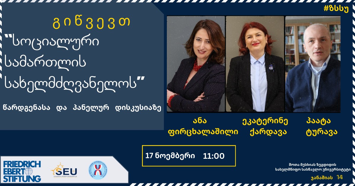 17 ნოემბერს 11 საათზე გიწვევთ წიგნის - „სოციალური სამართლის სახელმძღვანელო“ წარდგენასა და პანელურ დისკუსიაზე, სოციალური სამართლის სწავლების შესახებ. ნაშრომი არის საქართველოს სოციალური სამართლის სახელმძღვანელოს გამოცემის პირველი მცდელობა, დამოუკიდებელ საქართველოში და განკუთვნილია არა მხოლოდ სტუდენტებისთვის, არამედ ამ სფეროში მოღვაწე პროფესორ-მასწავლებლებისთვის, მკვლევარებისთვის, ასევე პრაქტიკოსი იურისტებისა და სოციალური სამართლის საკითხებით დაინტერესებული სხვა პირებისთვის.