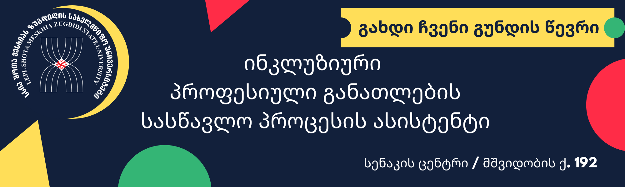 ზუგდიდის სახელმწიფო უნივერსიტეტი 2024 წლის 7 სექტემბრიდან აცხადებს კონკურსს, ინკლუზიური პროფესიული განათლების სასწავლო პროცესის ასისტენტის ვაკანტური თანამდებობის დასაკავებლად, 1 საშტატო ერთეული. / სენაკის ცენტრი/.