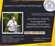 ზუგდიდის სახელმწიფო უნივერსიტეტის საპატიო დოქტორის, ჰეგელის საერთაშორისო საზოგადოების სამეცნიერო საბჭოს წევრის, ზუგდიდის სახელმწიფო უნივერსიტეტის ინტერდისციპლინური სასწავლო კვლევითი ცენტრის უფროსის პროფესორ მამუკა ბერიაშვილის საჯარო ლექცია თემაზე: „ზნეობრიობა, როგორც თავისუფლების ინსტიტუციონალიზაცია ჰეგელის ფილოსოფიაში“, ჰეგელის ფილოსოფიისადმი მიძღვნილი ბლოკსემინარების ციკლის ფარგლებში.