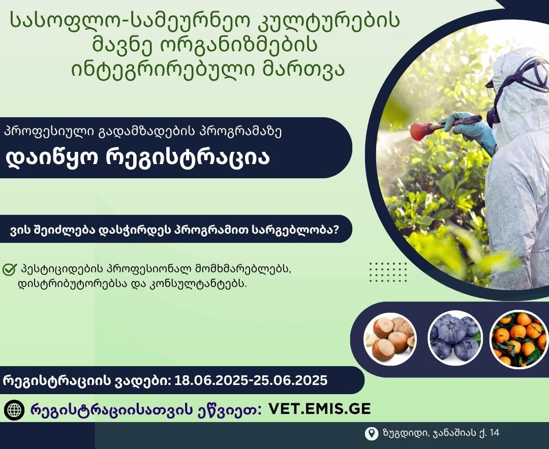 დაიწყო #რეგისტრაცია პროფესიული გადამზადების პროგრამაზე "სასოფლო-სამეურნეო კულტურების მავნე ორგანიზმების ინტეგრირებული მართვა"