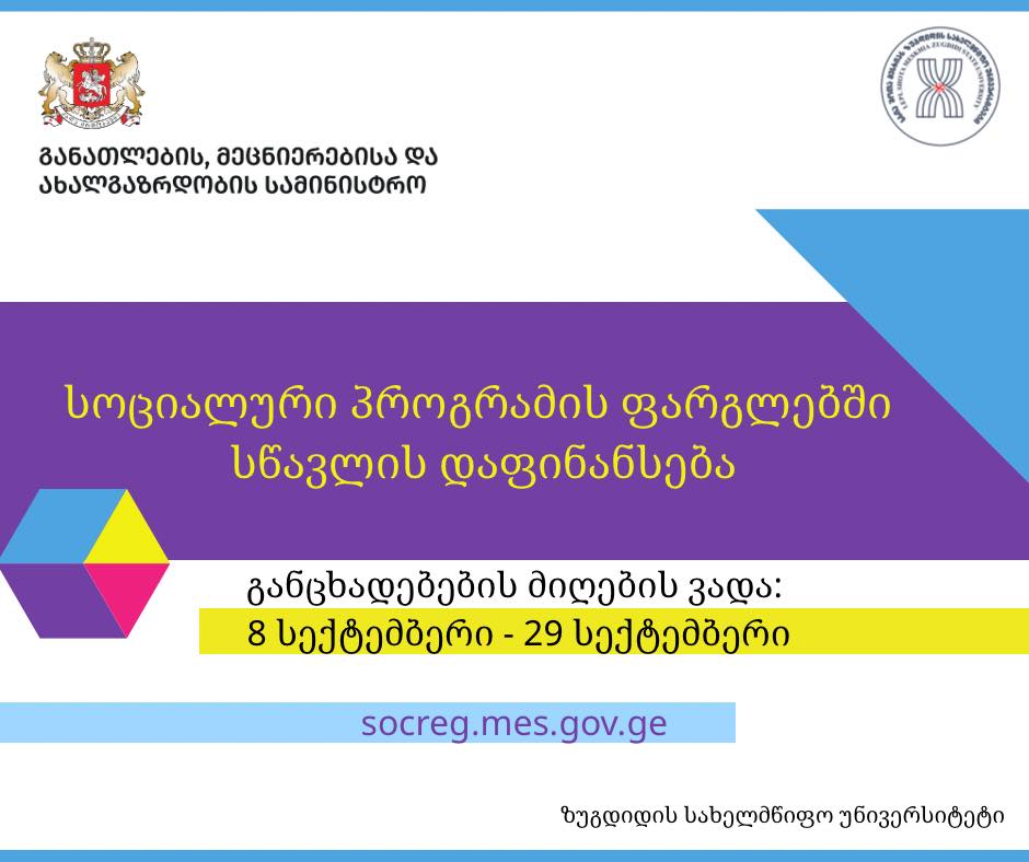 სოციალური პროგრამის ფარგლებში სწავლის დაფინანსებასთან დაკავშირებით, განცხადებები მიიღება მხოლოდ ონლაინ რეჟიმში 2025 წლის 8 სექტემბრიდან 29 სექტემბრის ჩათვლით, პორტალზე: http://socreg.mes.gov.ge