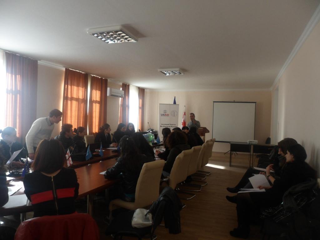 სტუმრები დაესწრნენ სასწავლო კურსის ,,დემოკრატია და მოქალაქეობის" ლექციას და კურსის ფარგლებში სტუდენტების მიერ მომზადებული სოციალური პროექტების პრეზენტაციებს. ხოლო შემდეგ გამართეს შეხვედრა ფოკუს ჯგუფში სამართალმცოდნეობის სპეციალობის მეოთხე კურსის სტუდენტებთან.